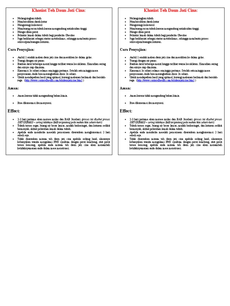 Cara pemesanan teh daun jati cina teh daun jati cina tradisional herbal dan alami untuk kesehatan dan pengobatan penyakit melangsingkan tubuh mengecilkan perut buncit mengurangi kadar kolesterol. Teh daun jati cina tidak dianjurkan untuk wanita yang sedang masa menstruasi ibu hamil seseorang yang berisiko pada penyakit gangguan ginjal. Kapsul dan teh daun jati cina adalah 100 alami dalam bentuknya yang murni daun jati cina kering.